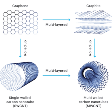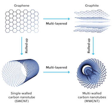 There are essentially two types of nanotubes: single-walled nanotubes (SWNTs) and multi-walled nanotubes (MWNTs), which differ in the arrangement of their graphene cylinders. Nanotubes with one wall are mostly curved and are narrower in diameter than the nanotubes with multiple walls (Khurana, 2022).